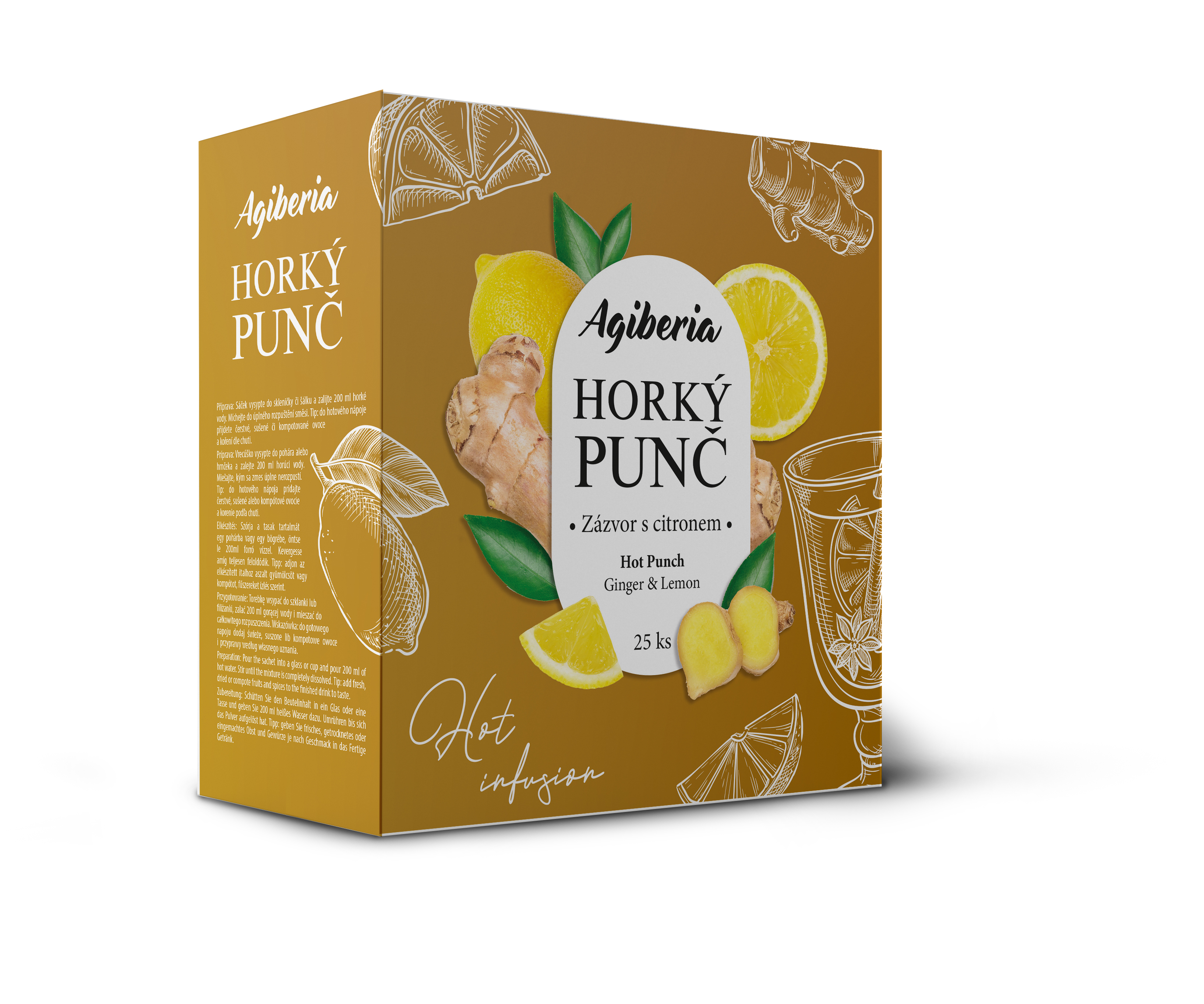Kombinácia zázvoru a citrónu v sebe spája to najlepšie z toho zimného a letného osvieženia. AGIBERIA Horúci punč s príchuťou zázvoru a citróna prináša mierne pikantnú chuť zázvoru doplnenú sviežou kyslosťou citróna, ktorú zvýrazňuje ovocná dužina a šťava zo sušeného ovocia. Výsledkom je nápoj s plnou, prírodnou chuťou bez umelých konzervačných látok, farbív a sladidiel. Balenie 25 jednorazových vrecúšok je ideálne na cesty, do hotelových izieb, recepcií alebo samoobslužných barov, kde sa punč pripraví rýchlo a jednoducho - stačí ho zaliať horúcou vodou. Nápoj si môžete vychutnať horúci na zahriatie počas chladných dní alebo studený ako citrusové osvieženie v lete. A ak chcete niečo špeciálne, výborne chutí aj v kombinácii s alkoholom.
